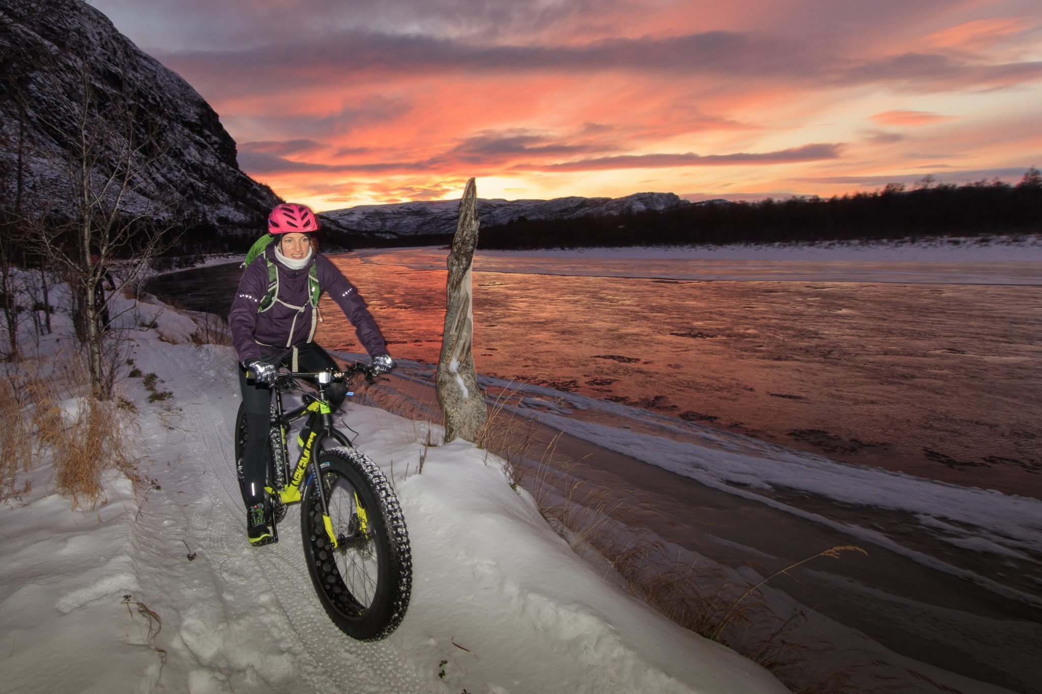 Det er en helt egen opplevelse å sykle (E) fatbike med hodelykt!. Lyset gir sterke kontraster og skyggene er så veldig tydelige at syklingen oppleves enkel. Så lenge vi holder oss på den preparerte stien! Med lykta på er mørket rundt oss totalt og vi bare aner at terrenget endrer seg når vi kommer ut av skogen. Så dukker månen frem bak en sky og hele landskapet lyser opp – det er ren magi! Med ett flammer nordlys opp, fra øst til vest, grønt, rødt, blått og dansende. Det er belønning det!