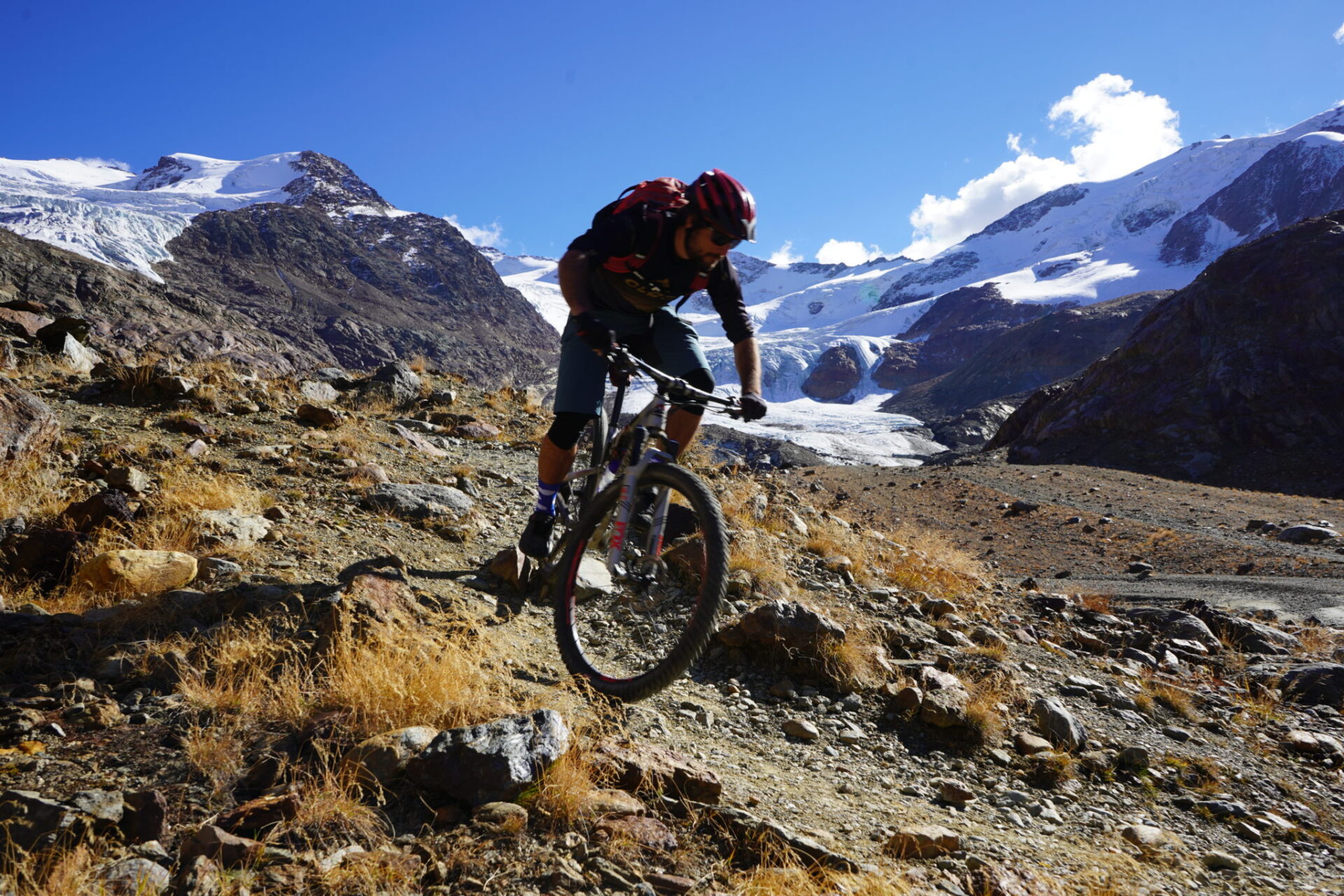 We leave Pontresina and start the climb up to the Bernina Pass. It’s flat into the valley until we reach a place called Morteratsch, where we turn right into the Morteratsch Valley. After a few kilometres, we reach the ice of the glaciers. It’s fascinating to see how fast the glaciers have receded over the past century. As the Morteratsch Valley is a dead-end road, we turn around and head back down to the Bernina Pass. We enter the upper parts of the pass with a good mix of smooth trails leading up to the final pass of the whole trip.